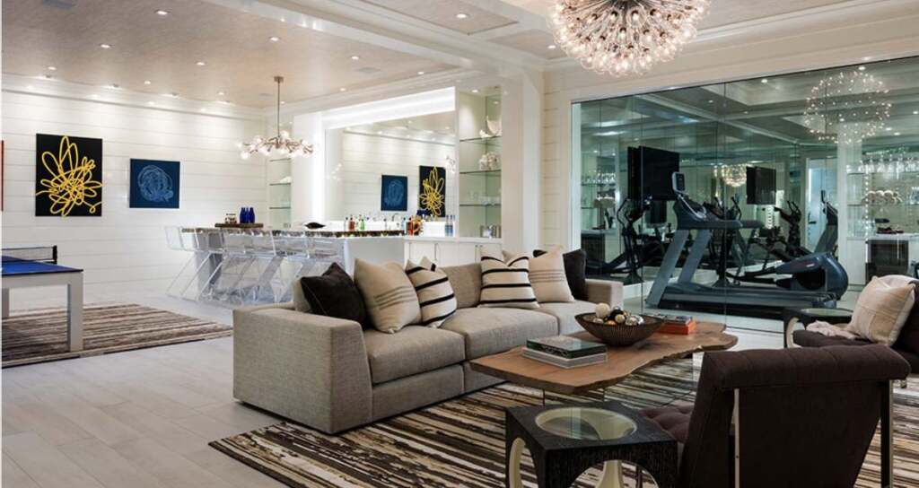 Marketed as move-in ready, the home is designed for entertaining and recreation. It includes an entertainment lounge with a full bar, a gym, an indoor basketball court, and a movie theater. The outdoor features comprise staff quarters, a pool house, a custom Gunite swimming pool with a spa, landscaped gardens, and a rooftop putting green.
