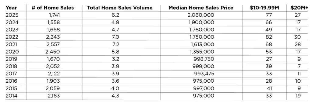The $10 million to $19.99 million range is where you start calling them properties instead of houses. Sales in this range have gone up every year for six years, from 53 in 2020 to 77 in 2025. The exception was 2022, with 82 sales. Even though the market was slowing down, this area was still doing well.