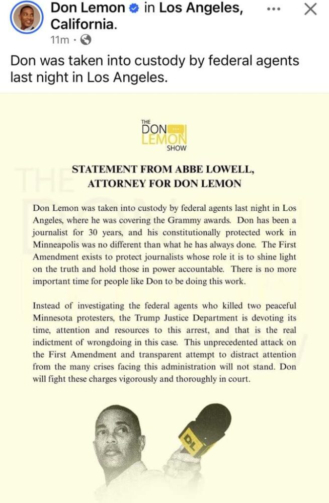 “Don Lemon was taken into custody by federal agents last night in Los Angeles, where he was covering the Grammy Awards. Don has been a journalist for 30 years, and his constitutionally protected work in Minneapolis was no different from what he has always done. The First Amendment exists to protect journalists whose role is to shine light on the truth and hold those in power accountable.